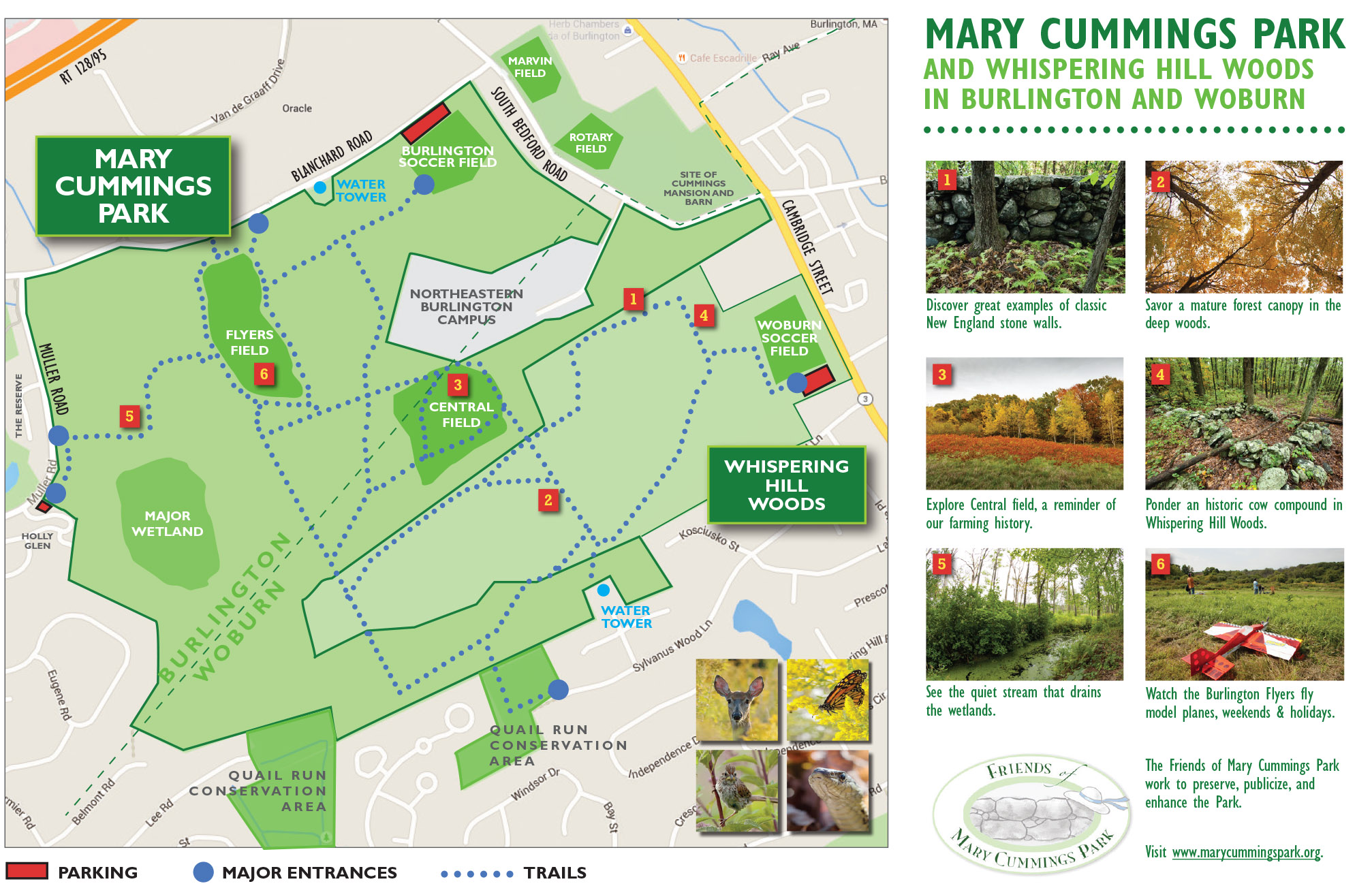Mary Cummings Park: Adjacent to Quail Run, Mary Cummings Park comprises over two hundred acres of public park given in trust to keep the land “forever open as a public pleasure ground.” There are walking trails and a model airplane landing field! Click here to open a map of the park.